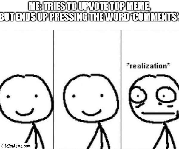 Also little kids when they find Santa Claus is breaking and entering their house. | ME: TRIES TO UPVOTE TOP MEME, BUT ENDS UP PRESSING THE WORD ‘COMMENTS’. | image tagged in realization | made w/ Lifeismeme meme maker