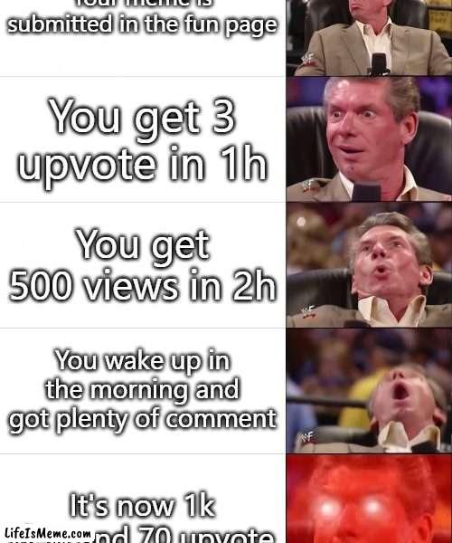 Casual Imflip user when their meme get popular (ignore all the "s" missing) | Your meme is submitted in the fun page; You get 3 upvote in 1h; You get 500 views in 2h; You wake up in the morning and got plenty of comment; It's now 1k view and 70 upvote | image tagged in vince mcmahon 5 tier,imgflip,imgflip users,memes,funny,front page | made w/ Lifeismeme meme maker