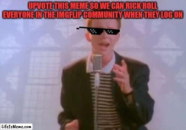 Don't you wanna rick roll millions of people? If so, help me do so by upvoting! | UPVOTE THIS MEME SO WE CAN RICK ROLL EVERYONE IN THE IMGFLIP COMMUNITY WHEN THEY LOG ON | image tagged in rick astley,memes,rickroll | made w/ Lifeismeme meme maker