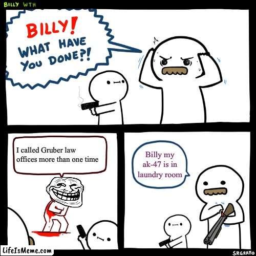 For those of you who dont know gruber’s slogan is “one call,thats all” | I called Gruber law offices more than one time; Billy my ak-47 is in laundry room | image tagged in billy what have you done | made w/ Lifeismeme meme maker