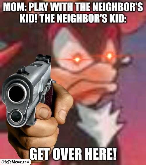 Shadow has your ip address :) ( don't as why i gave this meme such a title) | MOM: PLAY WITH THE NEIGHBOR'S KID! THE NEIGHBOR'S KID:; GET OVER HERE! | image tagged in shadow the hedgehog | made w/ Lifeismeme meme maker