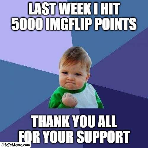 Thanks for all your views and upvotes! I'll keep making fun memes for you all! | LAST WEEK I HIT 5000 IMGFLIP POINTS; THANK YOU ALL FOR YOUR SUPPORT | image tagged in memes,success kid,accomplishment | made w/ Lifeismeme meme maker