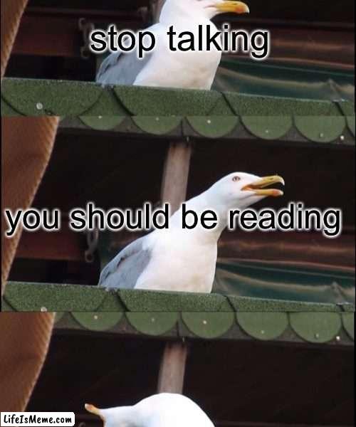Substitute teachers in primary school:; stop talking; you should be reading; BE QUIIIIEEEEETTTT | image tagged in memes,inhaling seagull | made w/ Lifeismeme meme maker