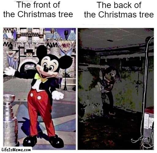 Too bad the back faces the window in my house. Also, UNLEASH THE CHRISTMAS MEMES! | The front of the Christmas tree; The back of the Christmas tree | image tagged in mickey good bad | made w/ Lifeismeme meme maker